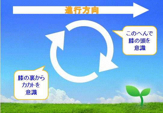 そうして後ろ半円からカカトの遠心力で勢いをつけた膝の頭を、前の半円へと向かって円心的に振り下ろします。 カカトからの流れで膝の頭を振り落ろす際はなるべくペダルを踏み込まないようにします。私はできるだけ 「半円の流れからの惰性」 を意識していました。