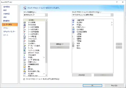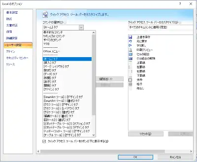 右下の 「Excelのオプション」 → 「ユーザーの設定」 からも同じ設定画面にアクセスできます。 お好きなアイコンや機能を追加されると使いやすくなると思います。
