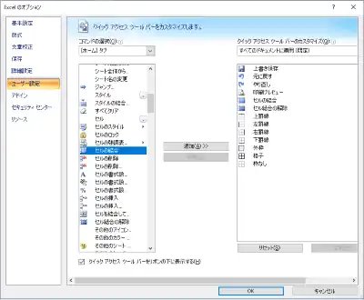 [ホーム タブ] を選択して表示される一覧の中から、例えば 「セルの結合」 を選択して真ん中のほうにある 「追加」 をクリックすると、下の画像の右の一覧の中にお好みのアイコンが追加されていきます。