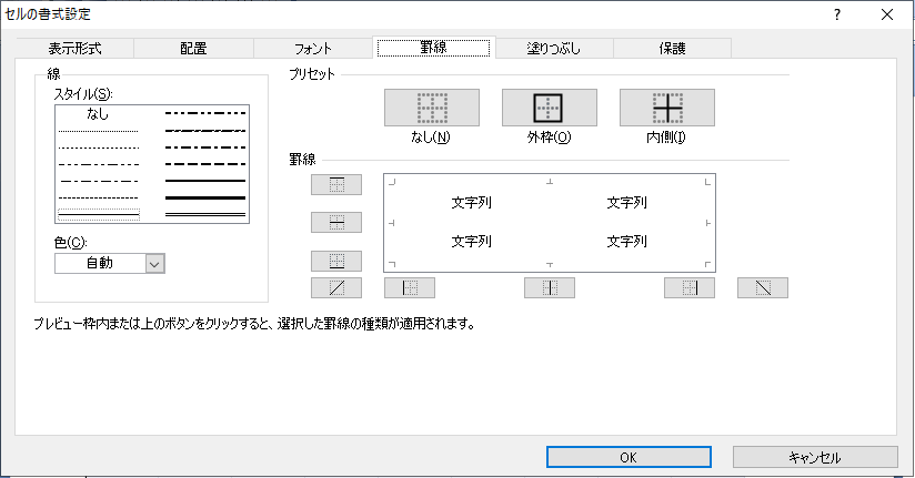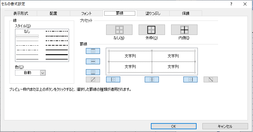 「罫線」 を選択して線のスタイルから 「なし」 の下にある 「点線」 を選択して 「外枠」 と 「内側」 を選択してOKを押します。 外枠だけ1本線にして囲ったりお好みのスタイルにできます。