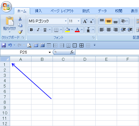 続いてExcelに戻って下の画像の位置にカーソルを合わせて 「全てを選択した状態」 にします。