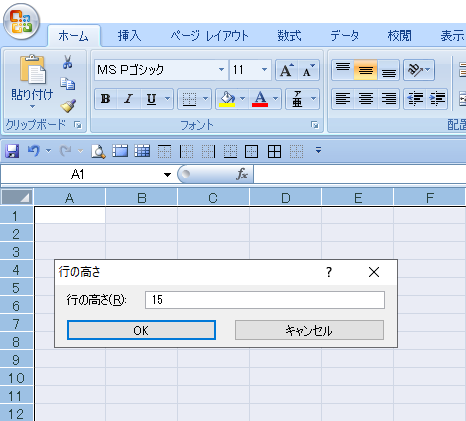 その行の高さの所に数値が入っているので半角数字で 「15」 という数値を入力します。(正方形にするためですのでお好みの数値でOKです)