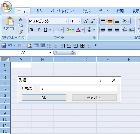 「列の幅」 の数値のところに同じく半角数字で 「2」 という数値を入力をしてEnterキーを2回押すか、 「OK」 をクリックして決定します。