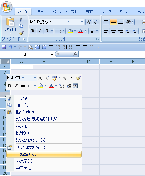 次に左の数字が並んでいる 「行」 の数字の部分でしたらどこでも構わないので、カーソルを移動させて 「右クリック」 をします。 右クリックして 「R」 キーを押してもらってもいいですし 「行の高さ」 という項目があるのでそちらを選択します。