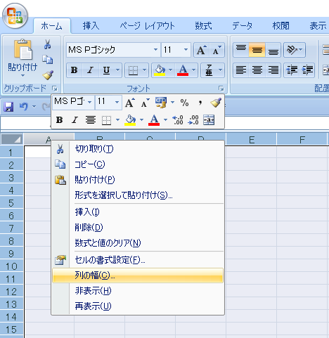 上のA B C D E…、と並んでいる列のアルファベットの部分ならどこでもいいのでカーソルを移動させて右クリックを押します。