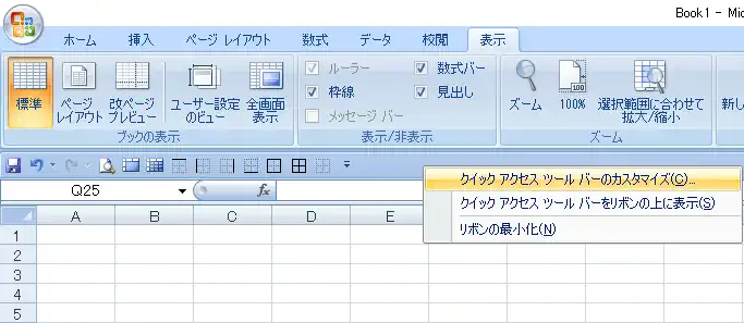 もし右クリックで 「クイック アクセス ツールバーのカスタマイズ(C)」 が出ない場合はExcelの左上のアイコンをクリックして、